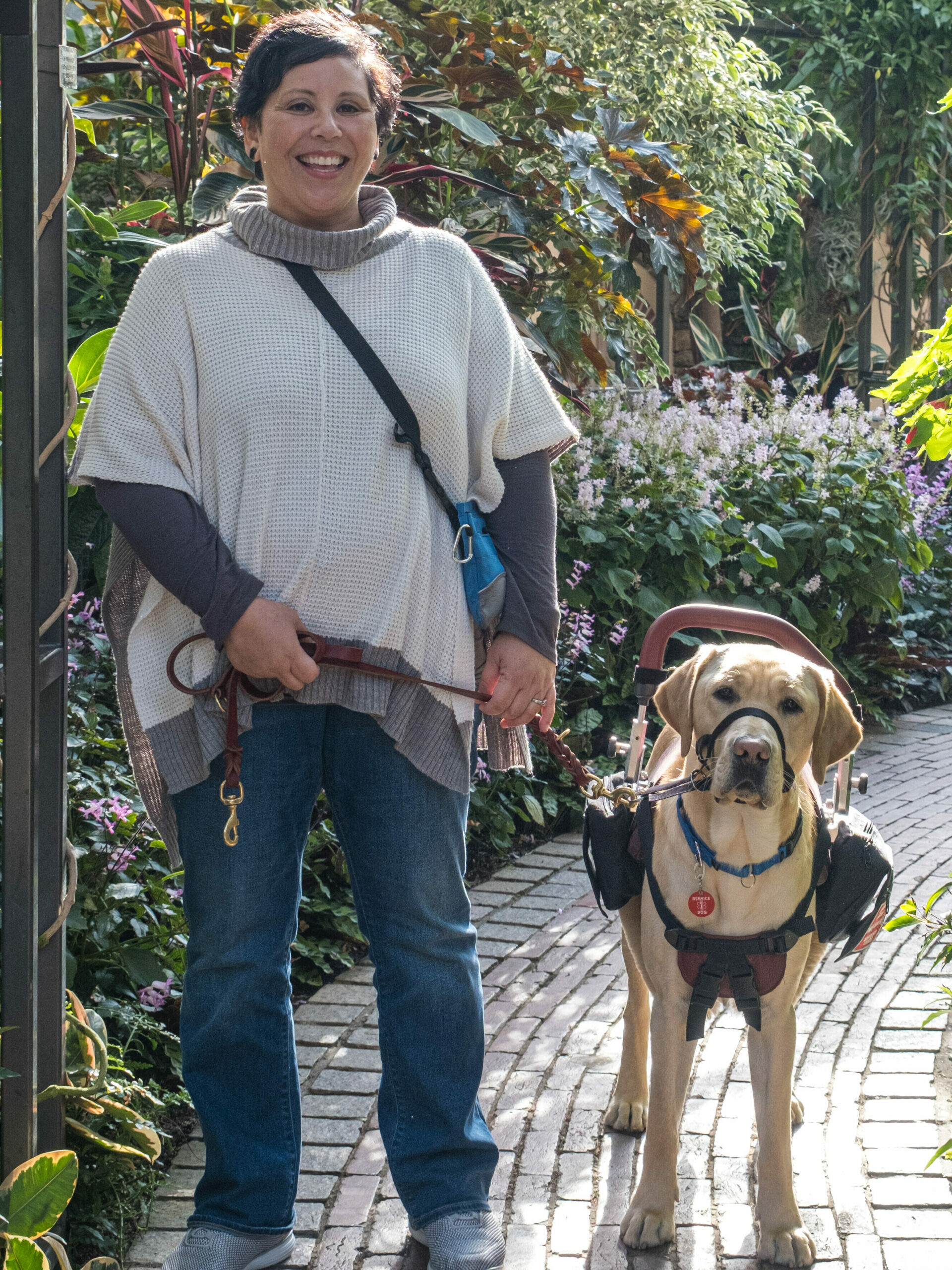 Balance and support dogs wear a carefully designed harness, which is custom fit to both the dog and their human partner. This harness can provide the dog’s handler a steady point of reference to assist with balance; a light pull to reduce fatigue; or physical support so they can move without falling or reduce the pressure put on a painful leg. Dogs must have the proper musculature, and be comfortable in the harness to be suited for this role. Many hours of training go into gradually acclimating them to the weight of the harness, the additional bulk when maneuvering tight spaces, and how their future handler might lean on or pull against the harness to stay safely on their feet.