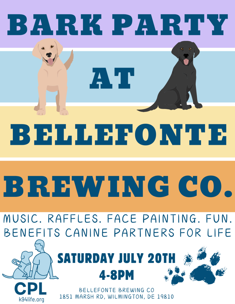 Join Canine Partners for Life for a Bark Party at Bellefonte Brewing Company’s Brandywine Location (1851 Marsh Road, Wilmington, DE 19810). Stop by for a drink, grab a bite to eat, and, of course, visit with a CPL dog or two. A special thank you to CPL volunteer, Tory, for organizing this fundraiser on behalf of CPL. We hope to see you there!