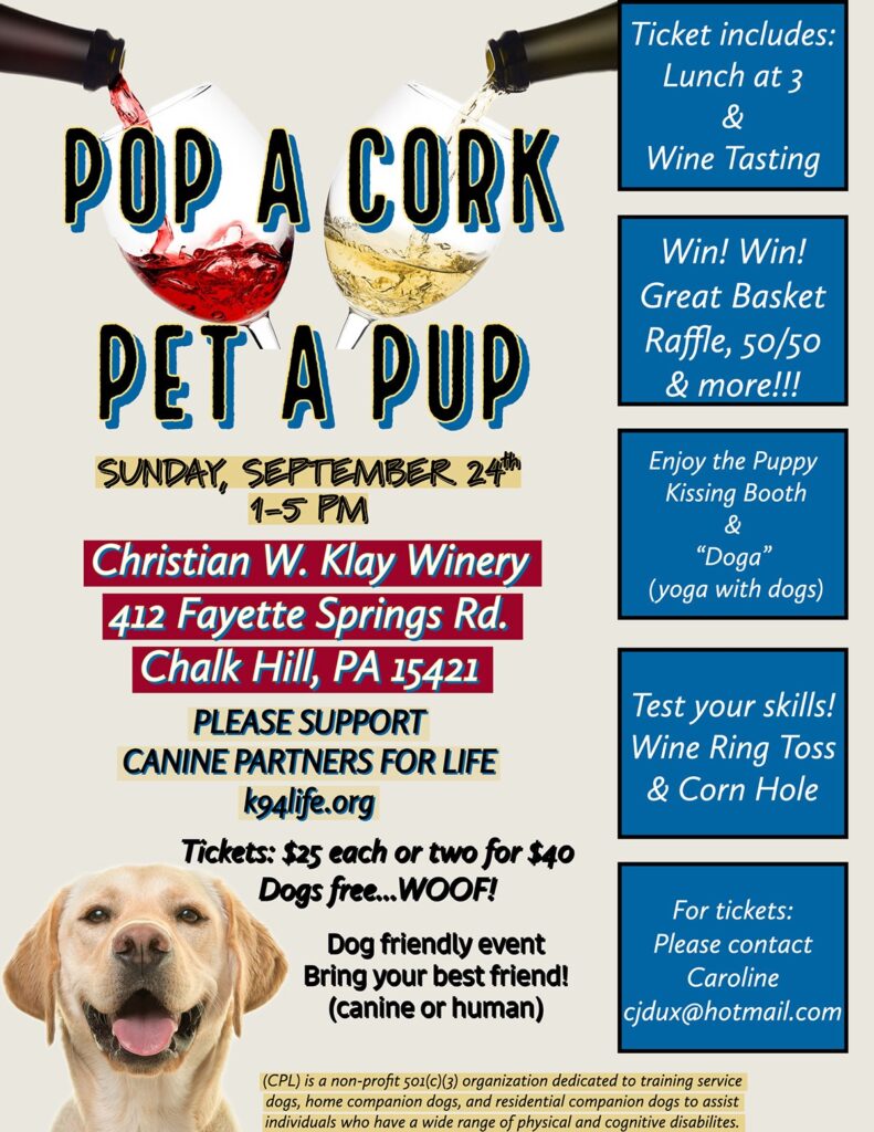 Join Canine Partners for Life for “Pop a Cork, Pet a Pup” a fun event at Christian W. Klay Winery on Sunday, September 24 from 1–5pm.